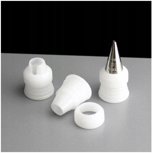 Adapter składa się z dwóch części: podstawy i pierścienia mocującego. Podstawę należy włożyć do worka cukierniczego, obciąć rożek worka w odpowiednim miejscu i dosunąć podstawę. Od zewnętrznej strony przykładamy wybraną tylkę i mocujemy ją pierścieniem. Jeśli chcemy zmienić rodzaj tylki w trakcie pracy wystarczy tylko odkręcić pierścień.