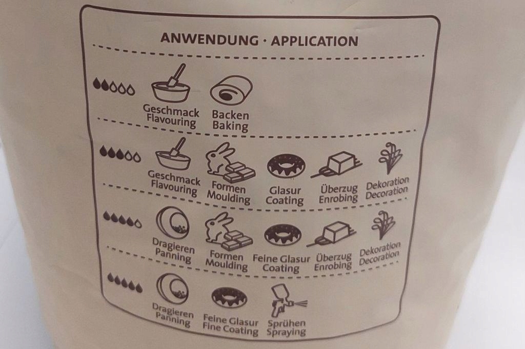 Przykładowo czekolada z oznaczeniem od jednej do dwóch kropli będzie idealnie nadawać się do aromatyzowania smakiem czekolady kremów, musów, nadzień do pralin lub lodów. Oznaczenie trzech kropli jest najbardziej uniwersalne – od kremów i nadzień po robienie tabliczek czekolady, korpusów czekoladowych, maczanych czekoladek i pralin. Czekolady z czterema oraz pięcioma kroplami świetnie sprawdzą się do maczanych czekoladek i pralin tworząc cienką warstwę na ich wierzchu oraz do fontanny czekoladowej.