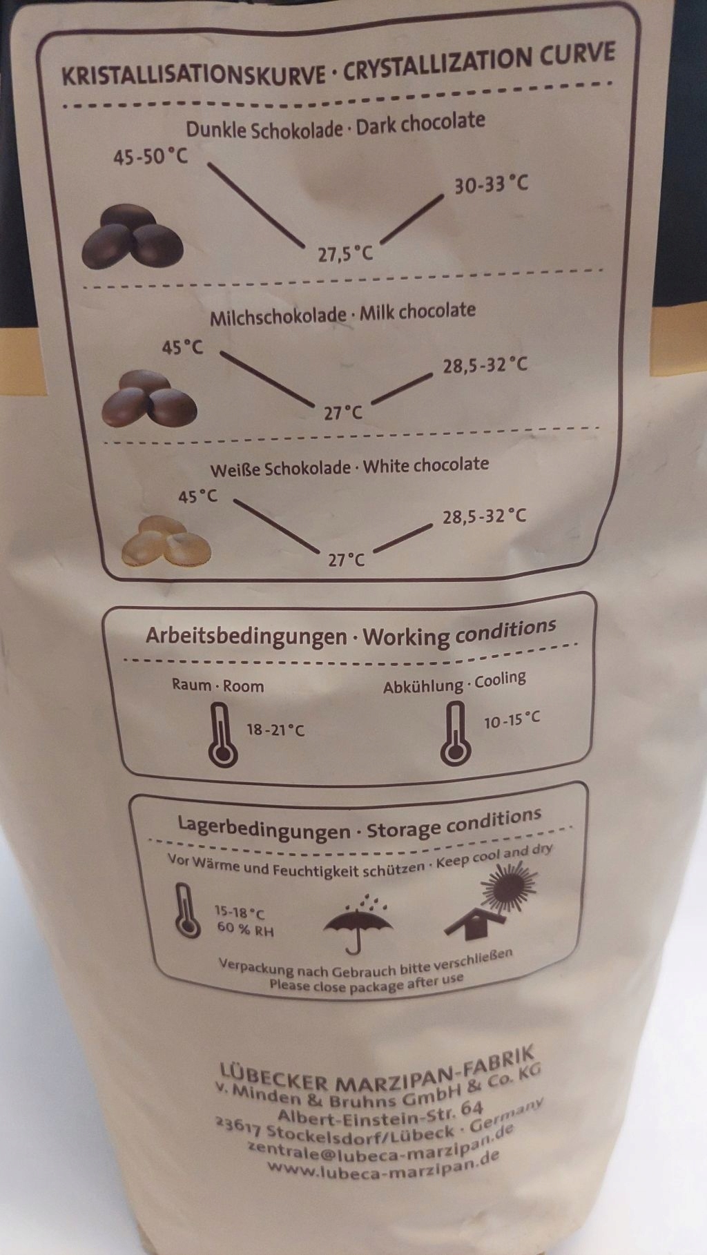 Czekolada Lubeca posiada status kuwertury czekoladowej co oznacza, iż zawiera więcej masła kakaowego (min. 32-39%),