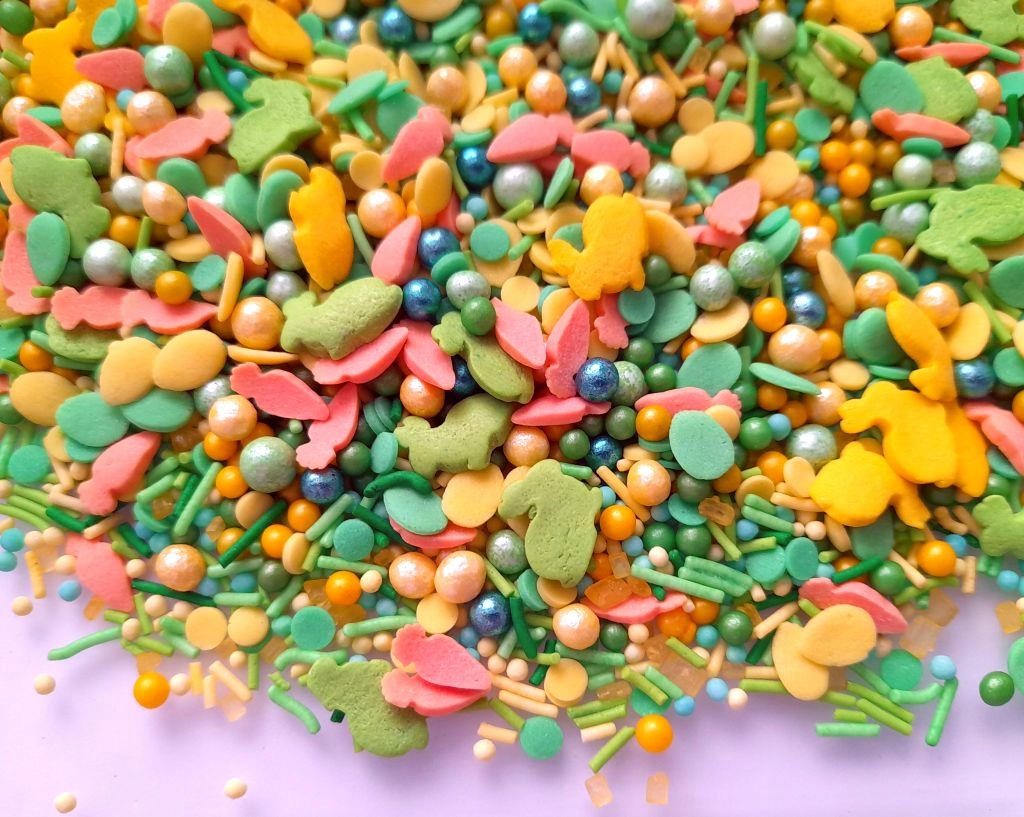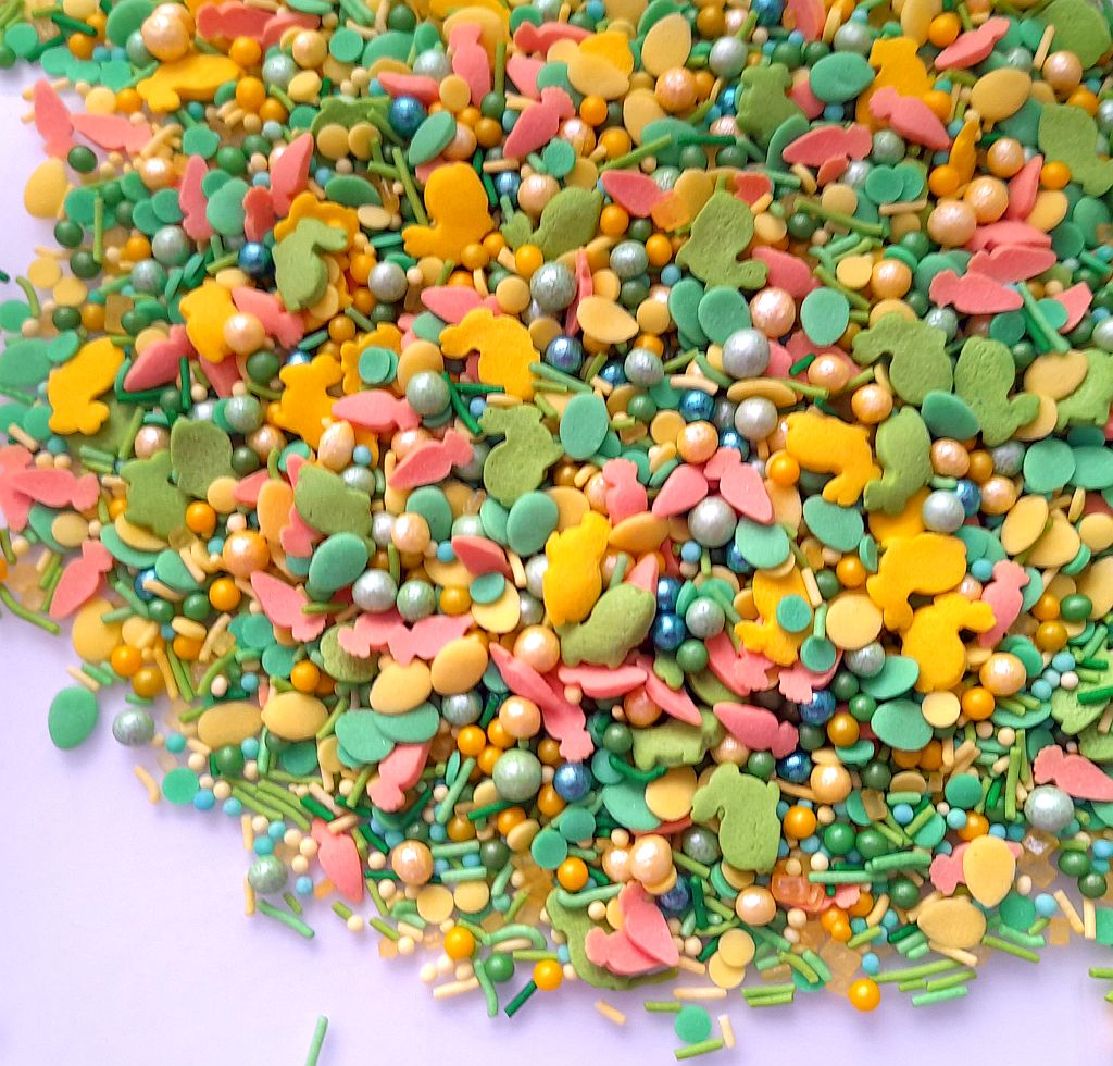 W skład mixu wchodzą kolorowe posypki w wiosennych kształtach i kolorach: jajka, marchewka,zajączki, kółeczka, perełki.