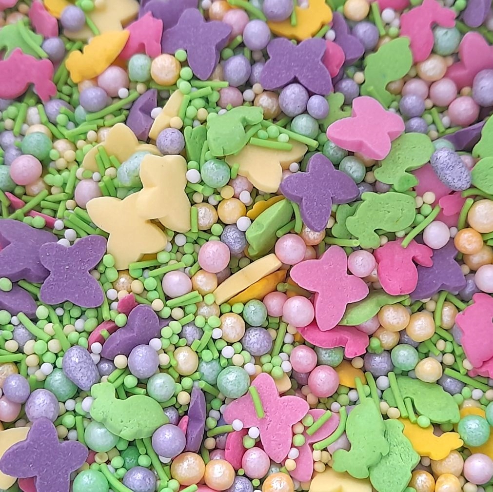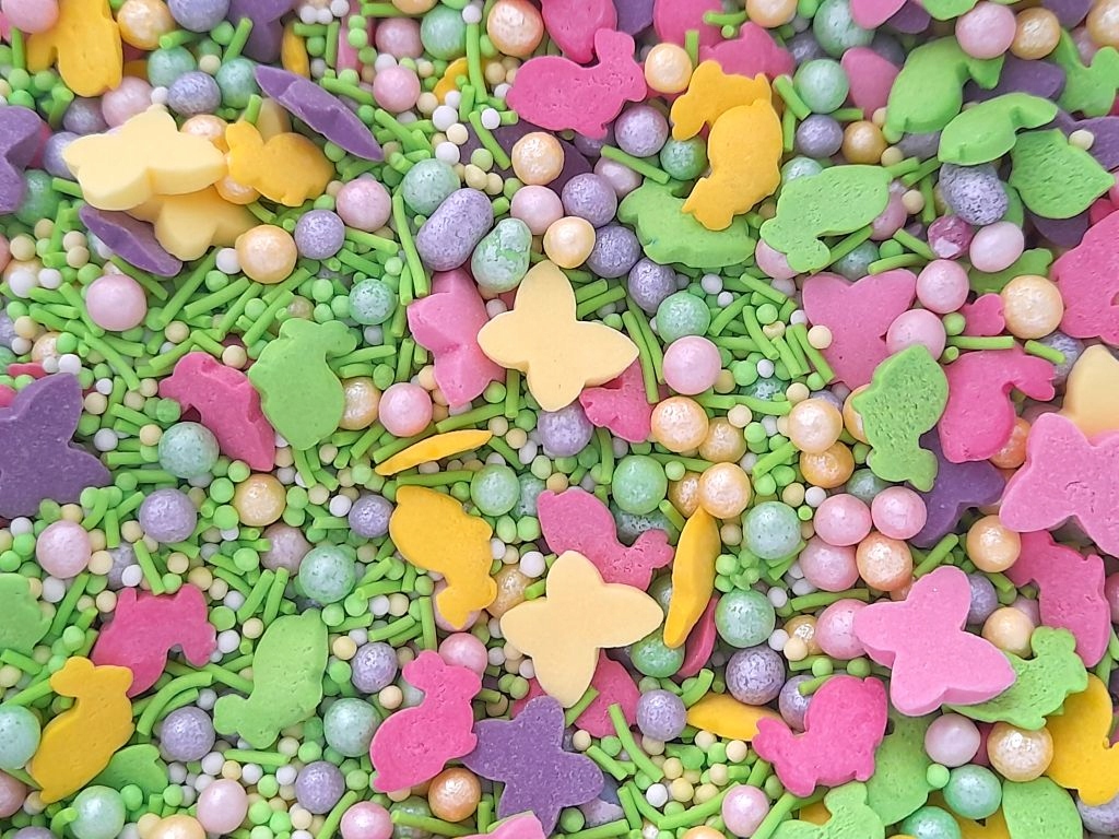 W skład mixu wchodzą kolorowe posypki w wiosennych kształtach i kolorach: motylki, zajączki, perełki.