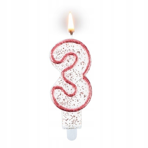 Świeczka w kształcie cyferki “3” biała z czerwoną obwódką, obsypana brokatem to elegancki i efektowny dodatek na każdą okazję – urodziny, rocznicę, jubileusz czy sylwestra.