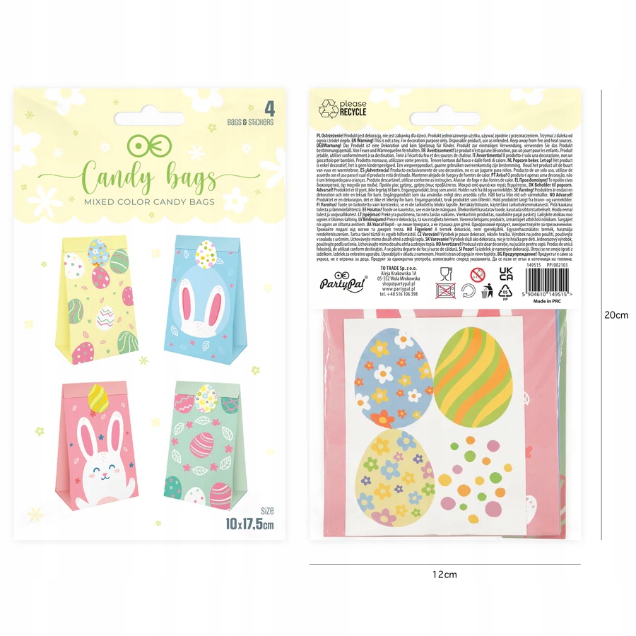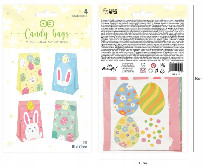 W opakowaniu znajdują się 4 sztuki, z czego każda prezentuje się nieco inaczej. Pierwsza z nich ma żółte tło z kolorowymi pisankami, druga ma niebieskie tło z uroczymi uszkami króliczka, trzecia ma różowe tło z nadrukiem zajączka, a czwarta posiada zielone tło z kolorowymi pisankami. Dzięki temu różnorodnemu zestawieniu kolorystycznemu, można dopasować torebki do indywidualnych preferencji i potrzeb.