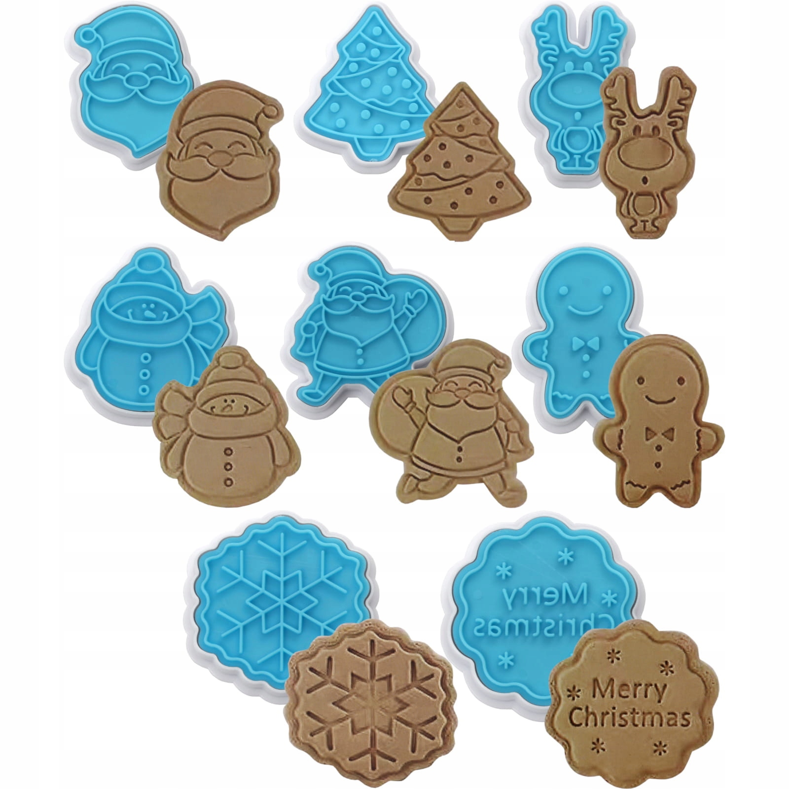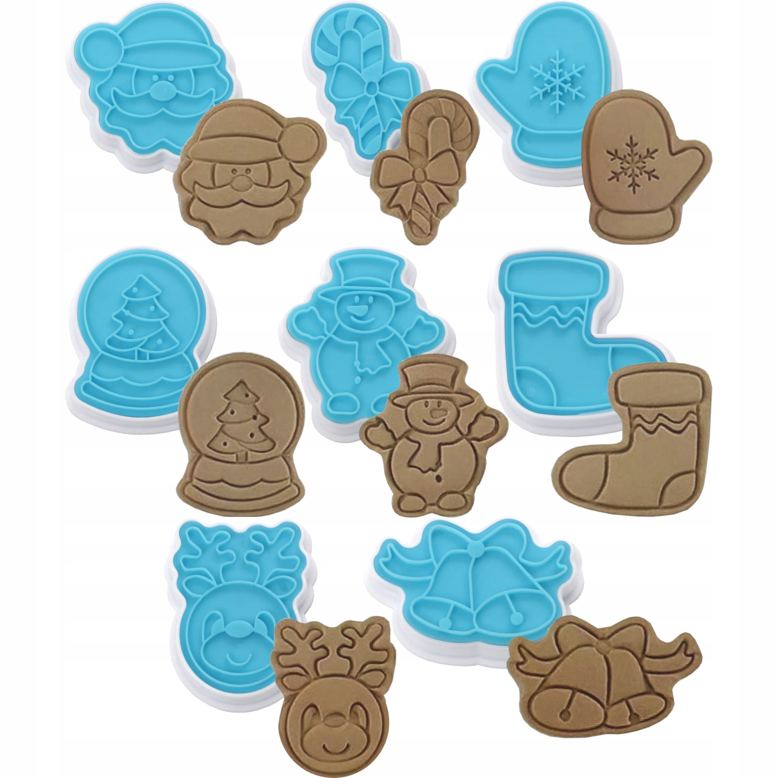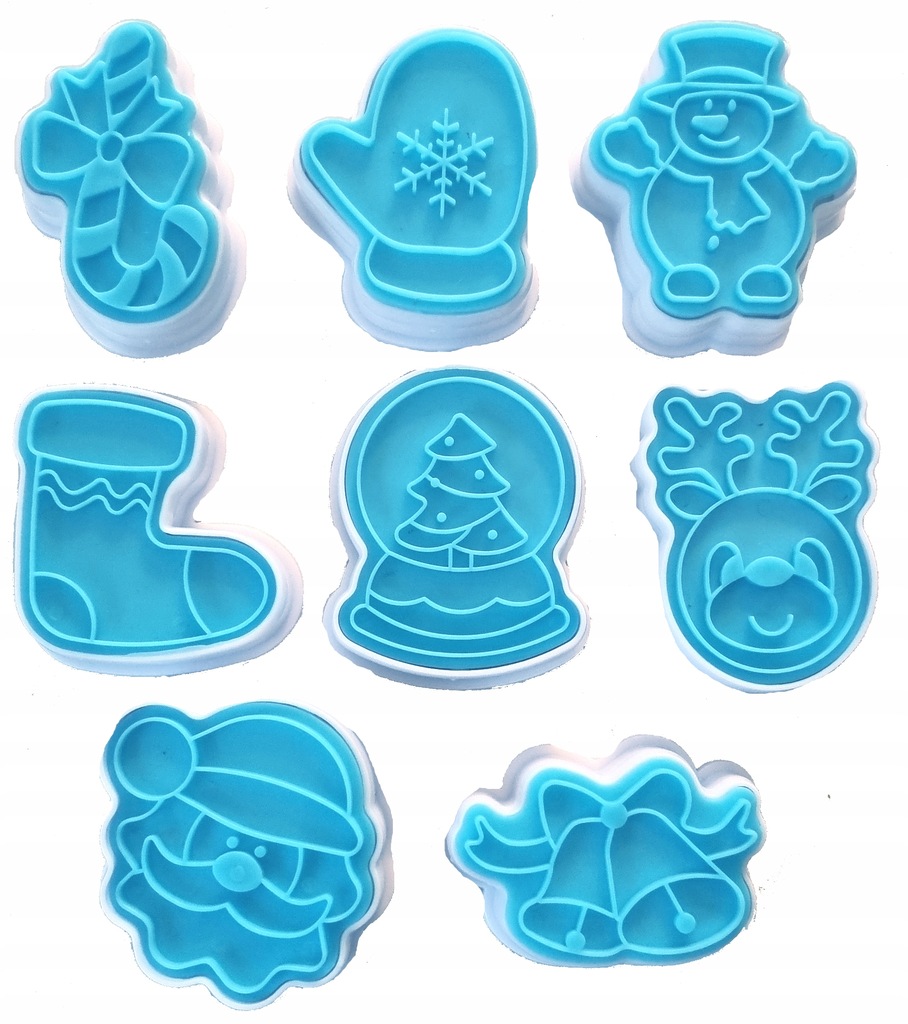 Zestaw 8 szt. łatwych w użyciu plastykowych wykrawaczy z tłoczkiem do wycinania ozdób z masy cukrowej do dekoracji tortów i ciast.